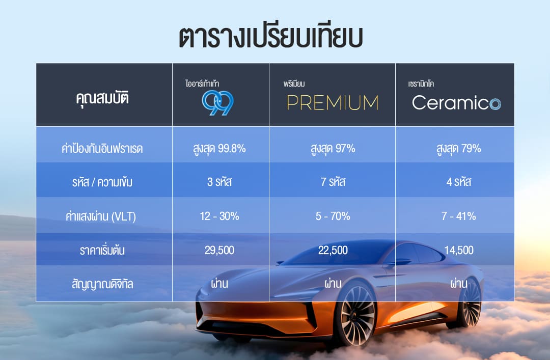 WINCOS (วินคอส) ใช้ Nano IR Technology ที่ช่วย “ป้องกันความร้อนได้สูงสุดโดยไม่รบกวนสัญญาณ” — ซึ่งถือเป็นคุณสมบัติสำคัญในยุคดิจิทัลที่ต้องพึ่งพาการเชื่อมต่อไร้สาย โดยมีให้เลือก 3 แพ็กเกจคือ IR99 / Premium / Ceramico ซึ่งหากไม่รู้จะเลือกแพ็กเกจไหนดี เปรียบเทียบได้ง่ายด้วยตารางดังนี้